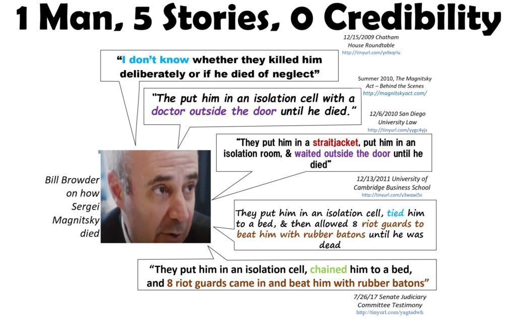Meer elementen uit Browders verhaal over Magnitsky bleken gelogen. Browder heeft altijd gezegd dat Magnitsky zijn advocaat was. Toen hij in New York onder ede werd gehoord, trok hij die bewering opeens in. Magnitsky had zelfs nooit rechten gestudeerd.